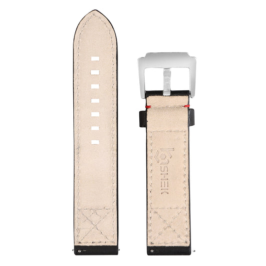 Boshek Black Genuine Leather Contrast Red Stitch Design Watch Strap. Silver Buckle Quick Release and Self Changeable FS337-BL-22-S