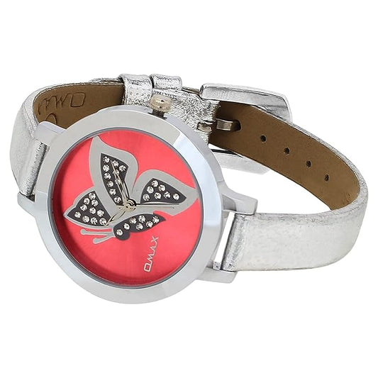 Omax Pink Butterfly Designed Dial with Foil printed Silver Genuine Leather Strap Watch for Girls and Women LS308