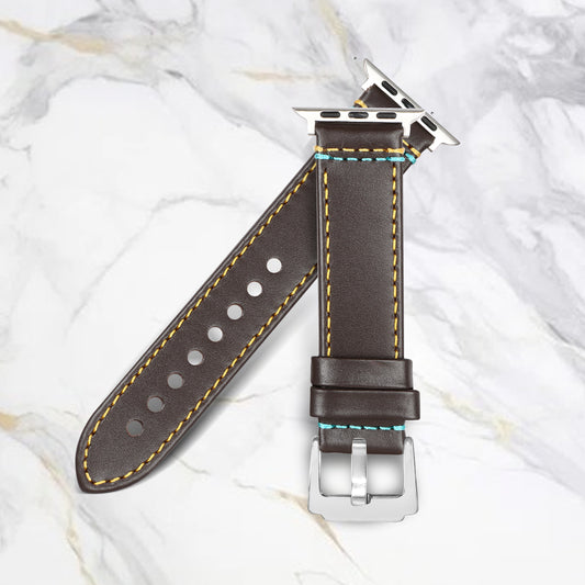 Boshek Brown Genuine Leather Double Yellow and Blue Stitch Design Watch Strap. Silver Stainless Steel Buckle Self Changeable FS307